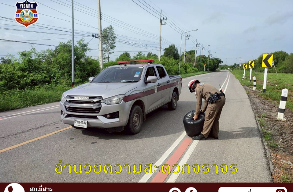 เจ้าหน้าที่จราจรเก็บถุงขยะตกอยู่บริเวณกลางถนนเส้นหน้าบริเวณ สภ.ยี่สาร
